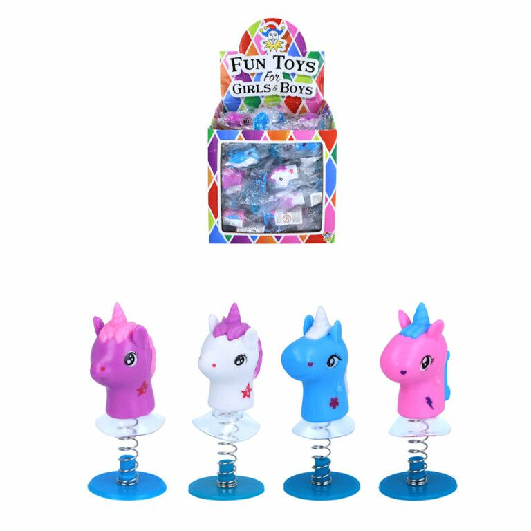 Erg leuk deze omhoog springende Unicorns. Druk de Unicorn naar beneden en wacht... vervolgens springt de Unicorn omhoog. Wordt in Mix kleuren geleverd in een mooie Display.