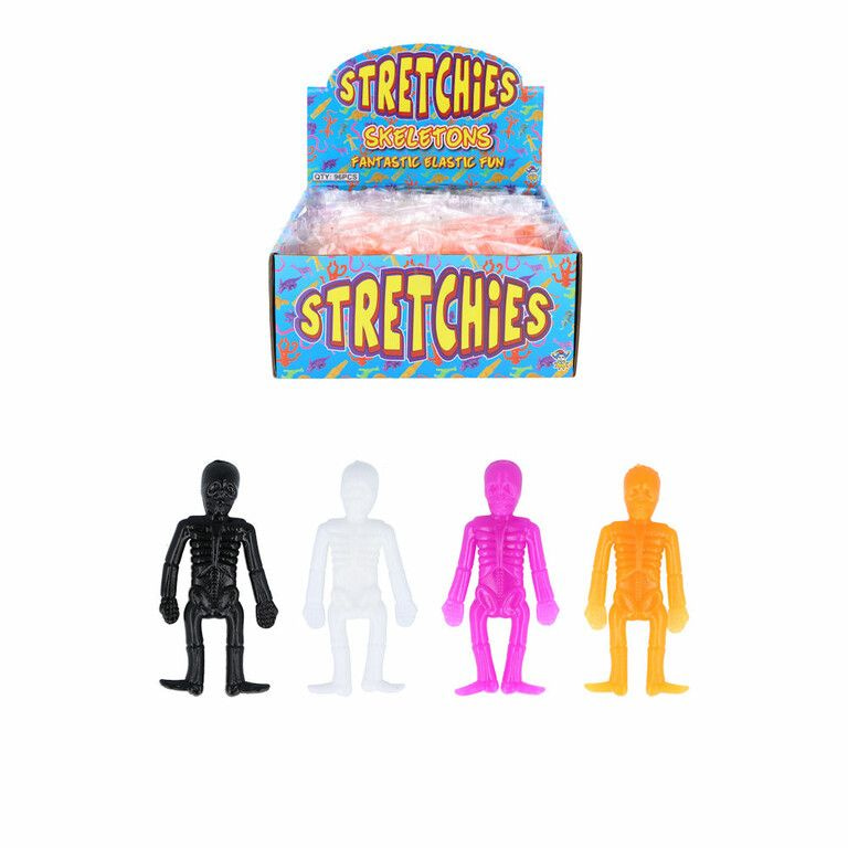 Erg grappig deze uittrekbare strech Skelet. Neem het skelet tussen je beide vingers en maak hem zo lang mogelijk. Verpakt in een mooie display. Wordt in Mix kleuren geleverd.