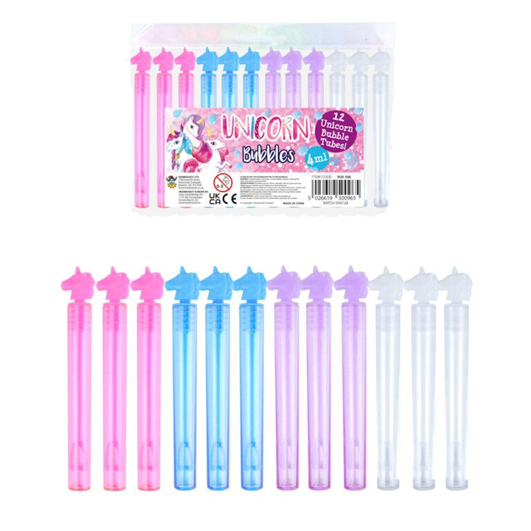 Fun, colorful mini bubble wands, unicorn model. Comes in a mix of colors.