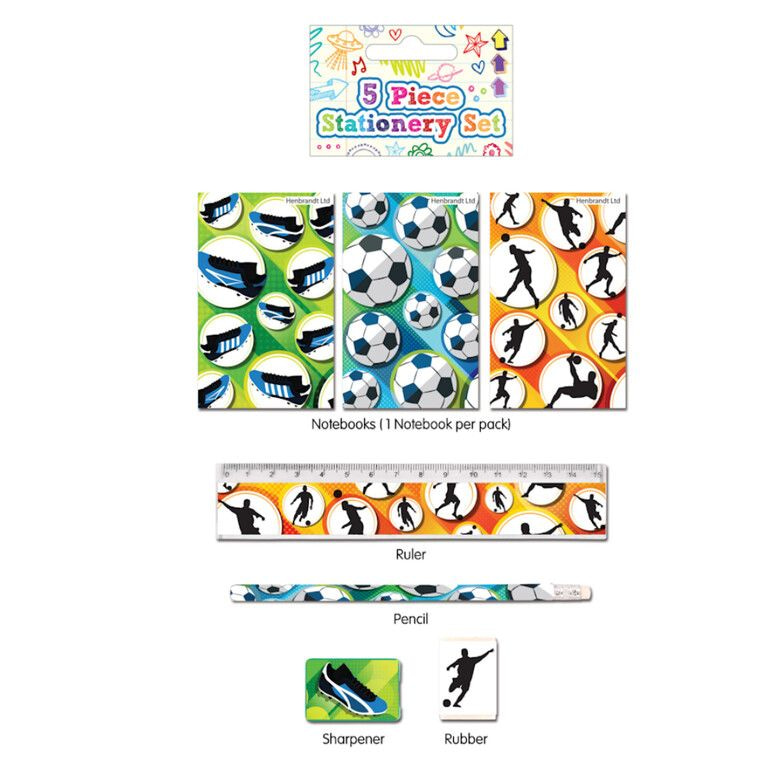 5-Piece Football Writing Set, consisting of: 1x Notebook, 1x Ruler, 1x Pencil, 1x Eraser and 1x Pencil Sharpener.