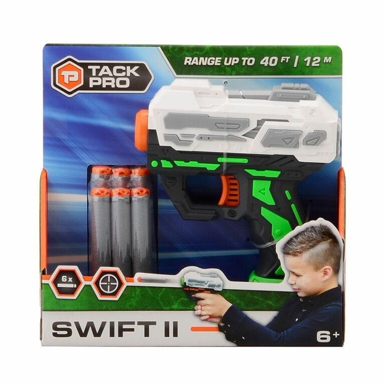 Met dit Tack Pro Swift II Pistool, voorzien van 6x Soft darts kun je tot wel 12 meter ver schieten! Schuif de dart in de loop van het pistool, trek de lader naar achter en haal de trekker over! Dit speelgoedpistool is 13 centimeter lang en gemaakt van kunststof.