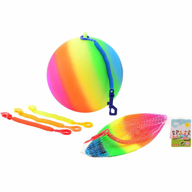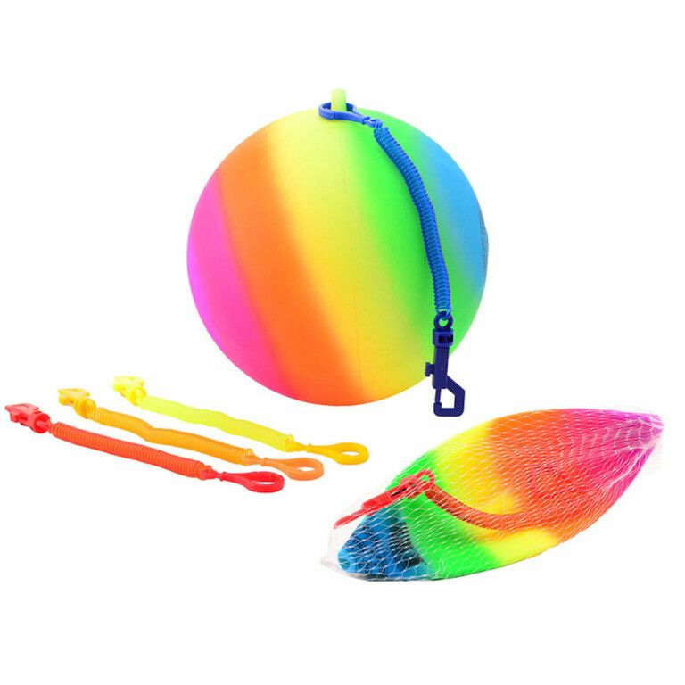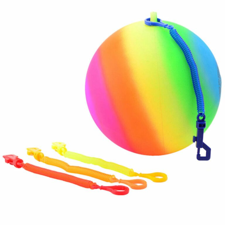 This Rainbow Bungee Ball is suitable for both indoor and outdoor use. Thanks to the elastic lanyard, you can bounce it up and down without it rolling away. Perfect! The lanyard is also easily removable, so you can play with it outdoors, including soccer.