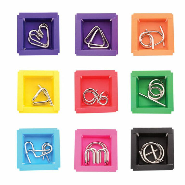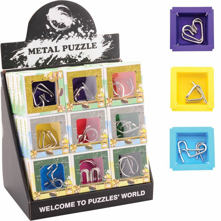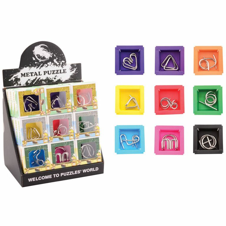 Erg leuke metalen IQ puzzels, afzonderlijk verpakt in een doosjes. Deze Display bevat 9 metalen IQ puzzels in verschillende moeilijksheids graden.