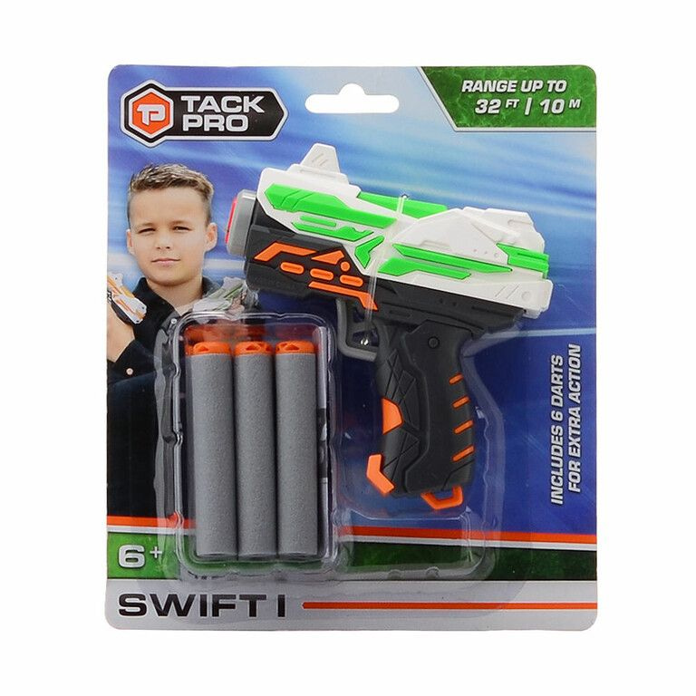 Met dit Tack Pro Swift I1 Pistool, voorzien van 6x Soft darts kun je tot wel 10 meter ver schieten! Schuif de dart in de loop van het pistool, trek de lader naar achter en haal de trekker over! Dit speelgoedpistool is 11 centimeter lang en gemaakt van kunststof.