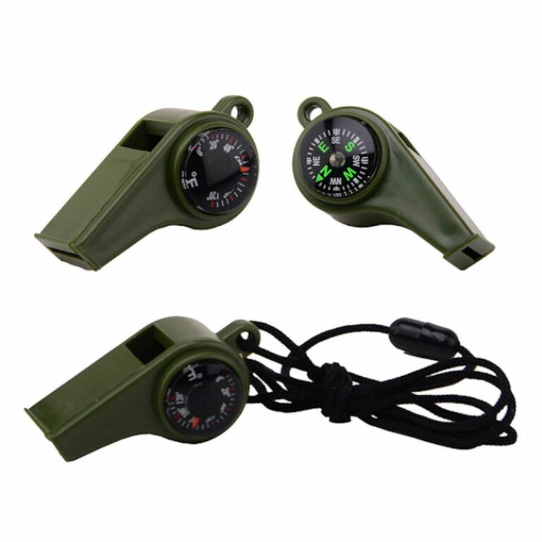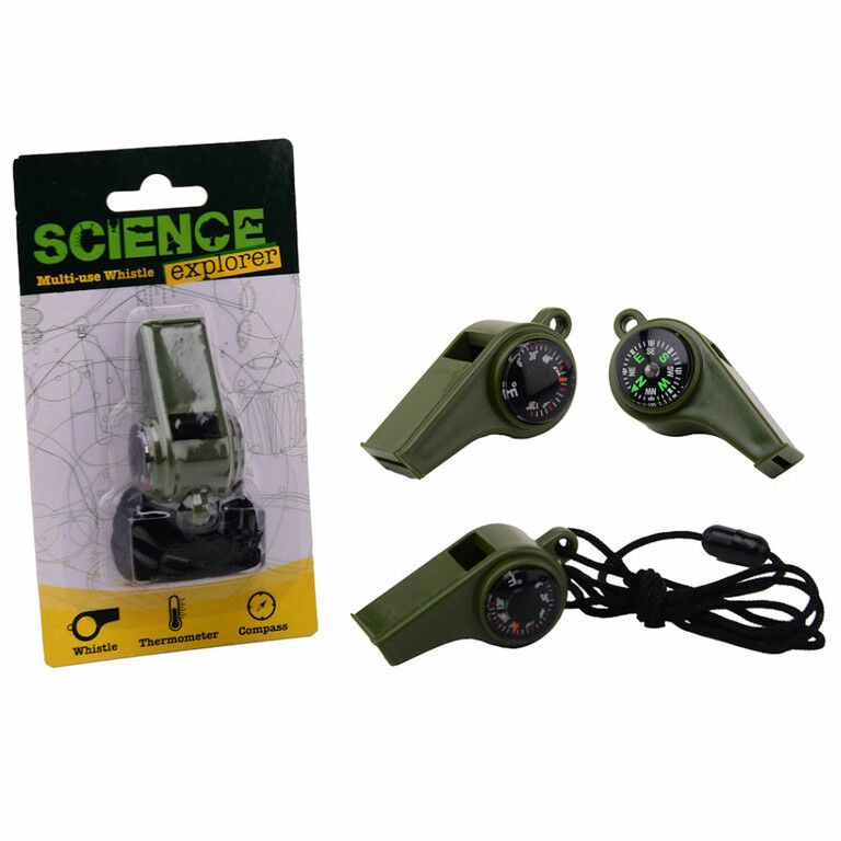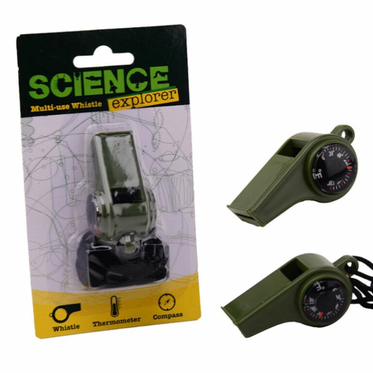 Stoere Science Explorer, Survival Fluit aan koord, met ingebouwd Kompas en Temperatuur meter. Wordt geleverd op een mooie kaart van: 8.5 x 15 x 3 Cm.