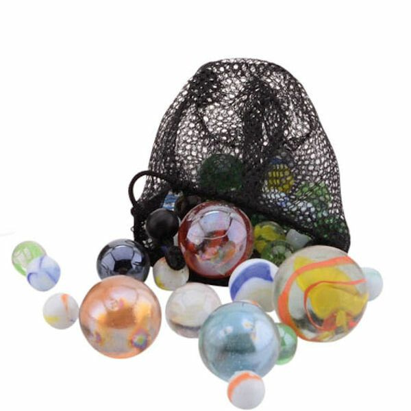 Prachtige complete Outdoor Fun knikker set, verpakt in een afsluitbare knikkerzak, voorzien van knikkers en bonken.