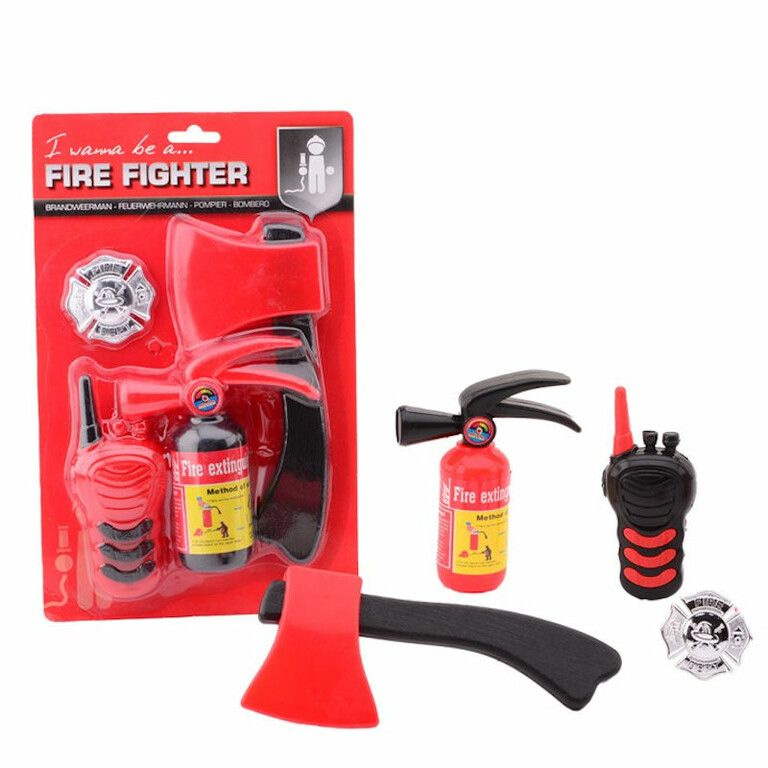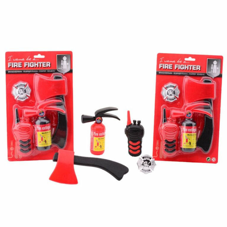 Brandweerman Speelset op kaart, bestaande uit: Brndblusser, Bijl, Speelgoed Portofoon en Brandweerman Badge.
