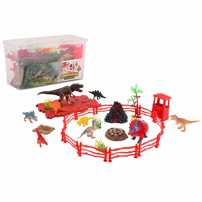 De Dino speelset bestaat oa uit: 8 dino's en diverse accessoires (o.a. vulkaan, hek, boom en planten etc.)