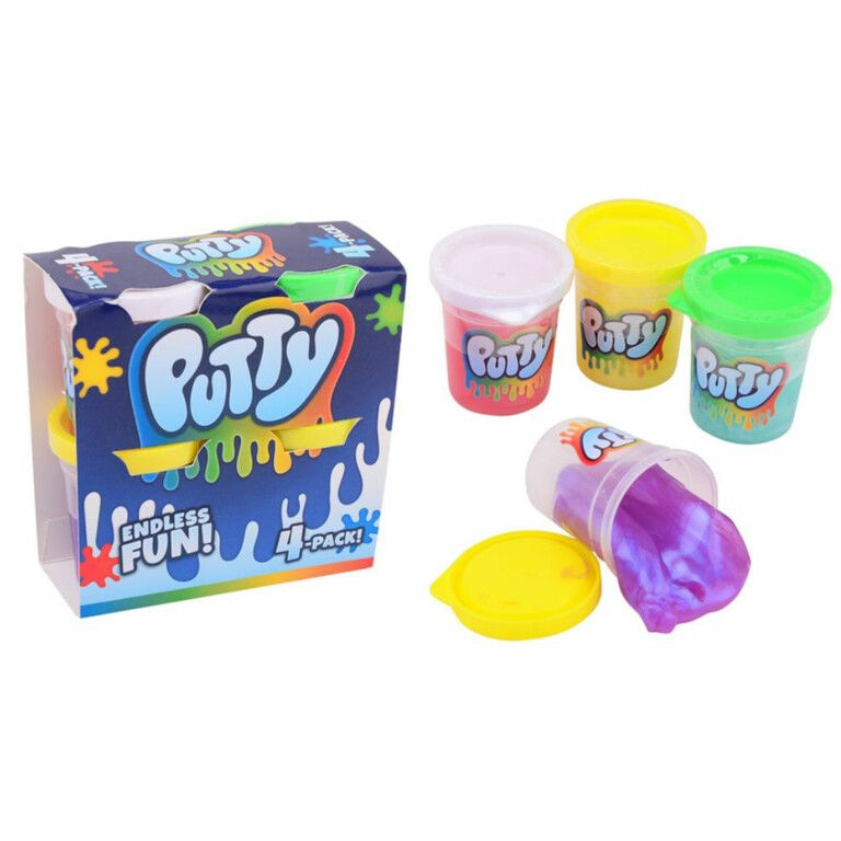 Met slijmerig putty in 4 verschillende kleuren: Rood, Groen, Geel en Paars.