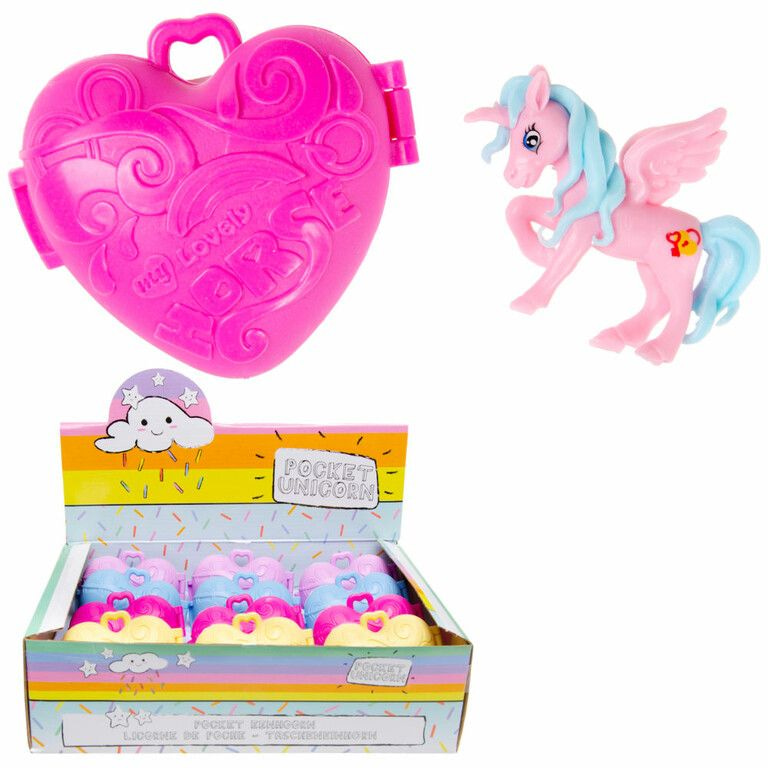Very nice Pocket Unicorns packed in a big heart, with a Unicorn inside. So that you can always easily take your favorite unicorn with you. Comes in Mix colors in a display.