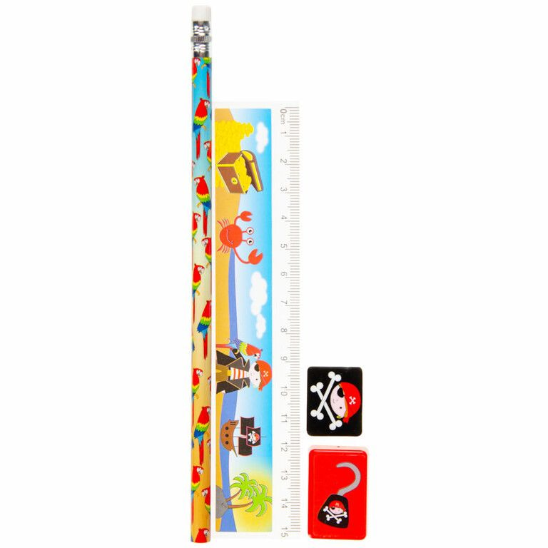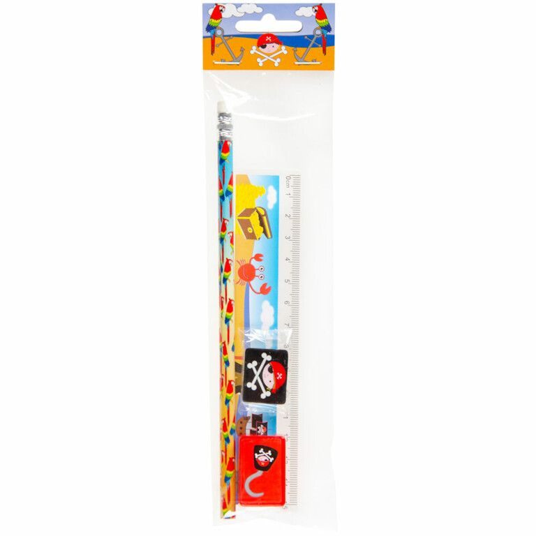 Nice 4-piece Pirate drawing set, consisting of: 1x Pencil, 1x Ruler, 1x Sharpener & 1x Eraser.