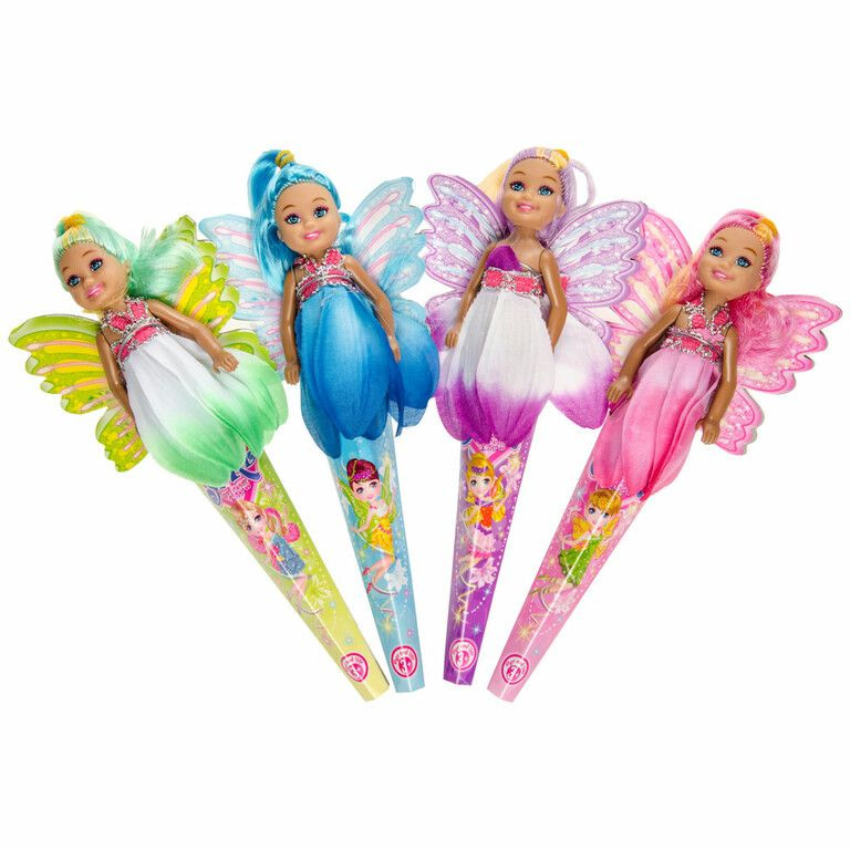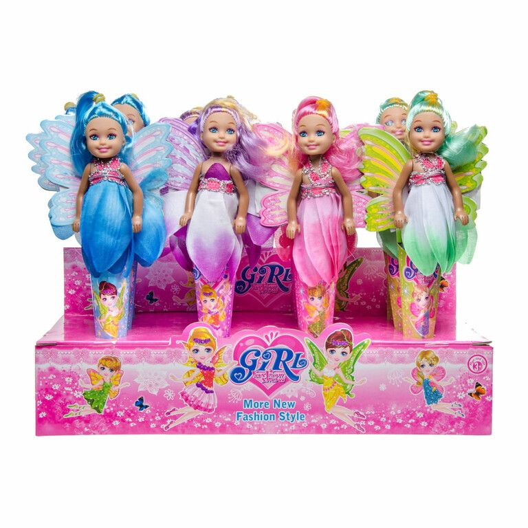 Cute fairy dolls of 21 Cm. high. Packed in Mix colors on a nice display.