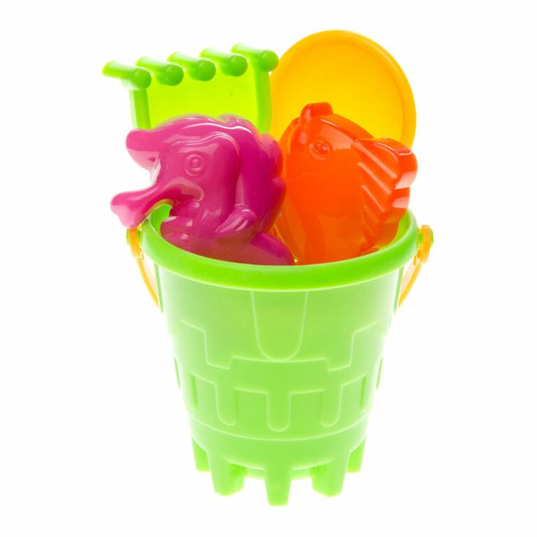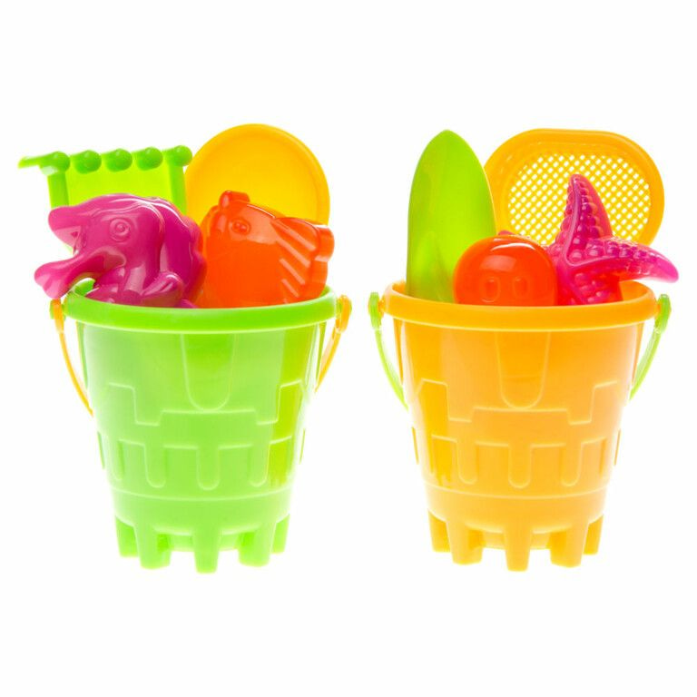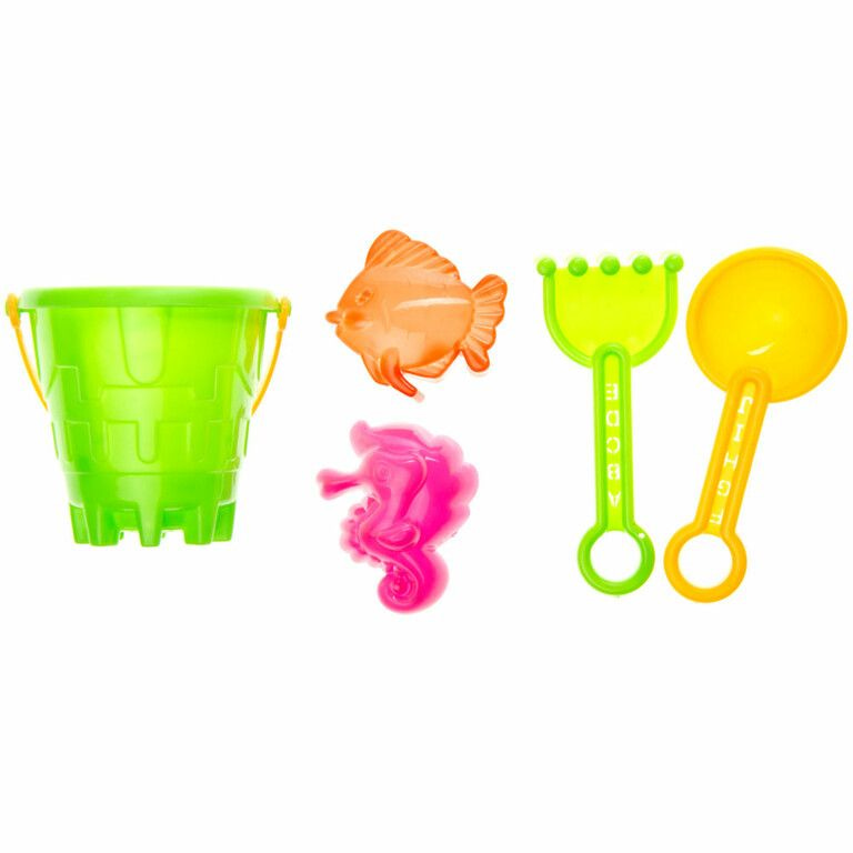 Leuke kleine weggeef Strandspeelset, bestaande uit: emmertje, vormpjes, harkje en schepje.