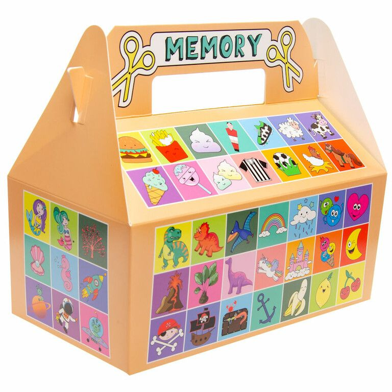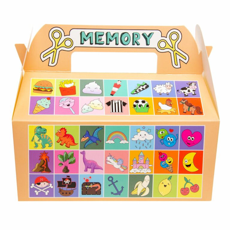 Grote Menuboxen, model: Memory. Knip de plaatsje op de menubox uit, en je kunt memory spelen. Foodsafe. Afmetingen: 22.5 x 12 x 9.5 Cm