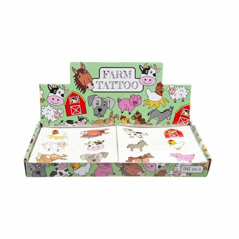 un Tattoo's vellen met elk 6 Tattoo's, Model: Boerderij Dieren. Afmetingen Tattoo vel: 12 x 12 Cm. Wordt geleverd in een mooie display met 96 Stuks Tattoo vellen a 6 Tattoo's.