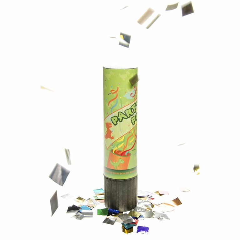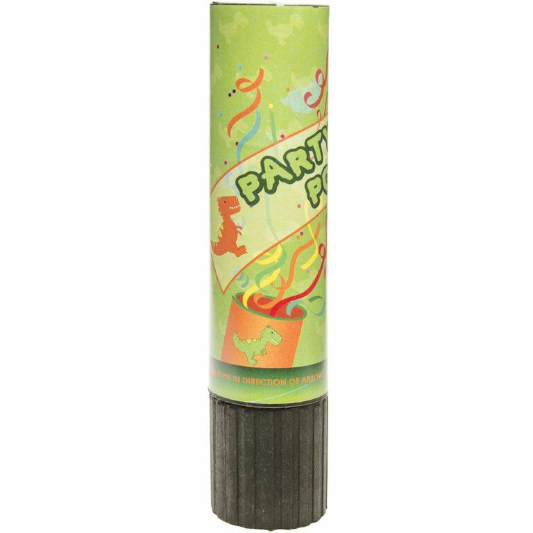 Party Confetti Shooter, model: DINOSAURUS Draai de knop om aan de onderzijde en de confetti schiet eruit ! Afmetingen: 4.5 x 4.5 x 20 Cm.