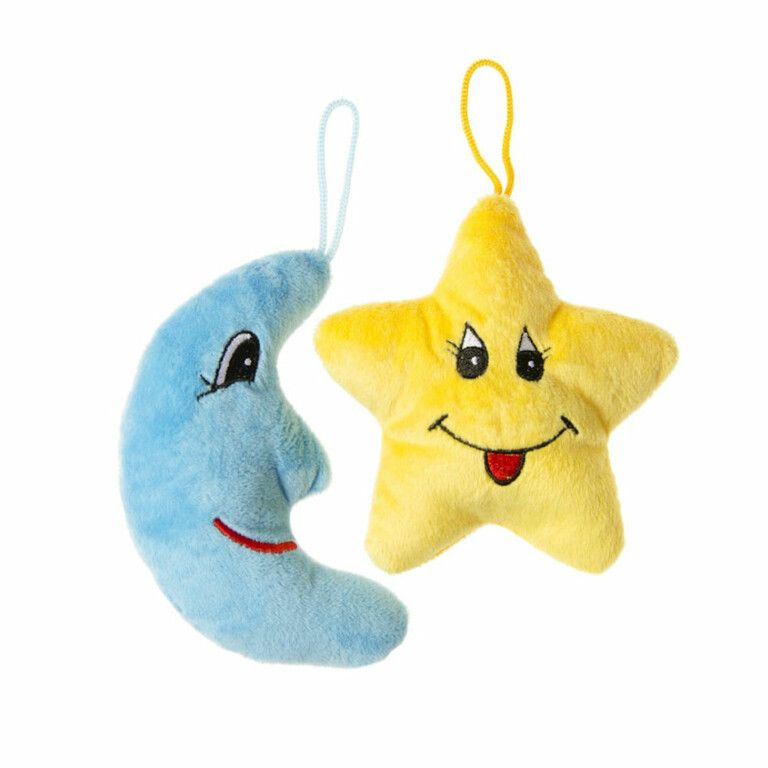 Pluche Maan en Sterren. Wordt in Mix soorten geleverd. Afmetingen Maan: 13 x 13 x 3 Cm. Afmetingen Ster: 15 x 8 x 3 Cm.
