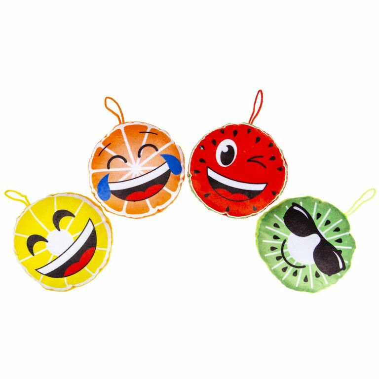 Vrolijke PLuche Smiley Fruit. Wordt in Mix soorten geleverd. Afmetingen: 12 x 12 x 3 Cm.
