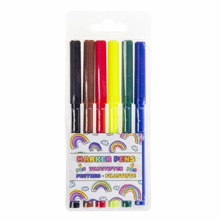 6-Delige pakjes met Viltstiften. Afmetingen van 1 pak Viltstiften: 6 x 14 x 0.5 Cm.