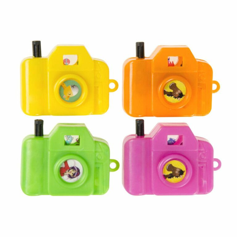 Small slide camera with animal pictures. Look through the lens of the camera and press the button. The turntable starts to turn and you see different nice animal pictures.