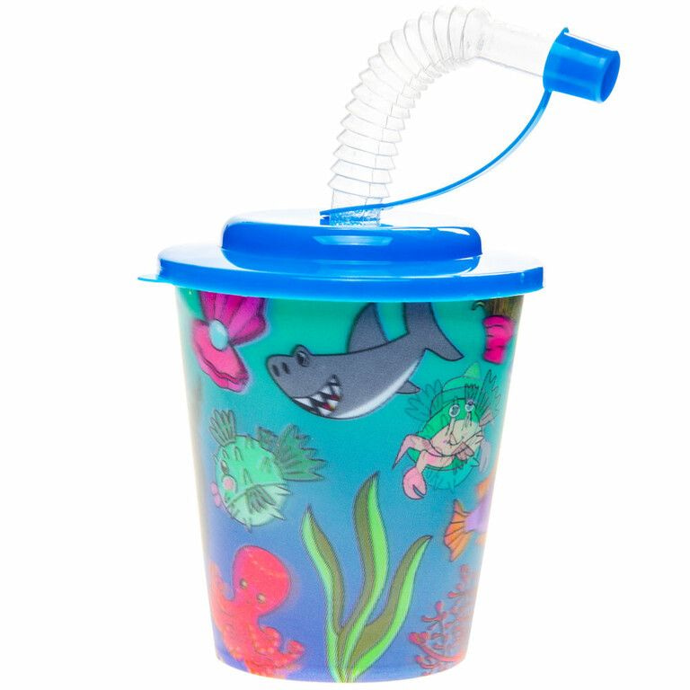 Handige Drinkbekers / IJsbekers, voorzien van Deksel en Rietje. Model: ZEEDIEREN. Inhoud: 250ML.