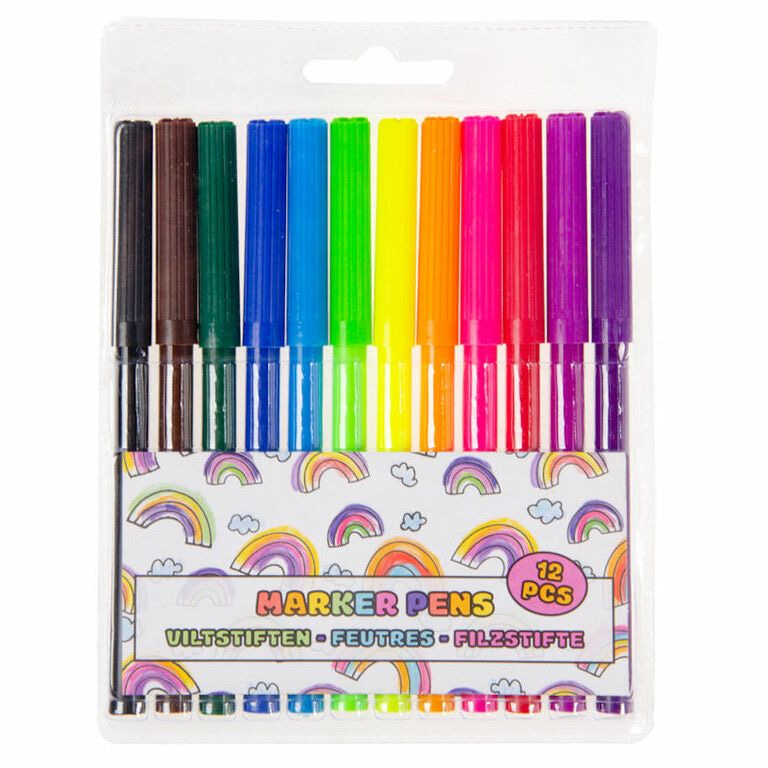 12-Delig pak met Grote Viltstiften. Afmetingen van 1 pak = 12 x 14 x 0.5 Cm.