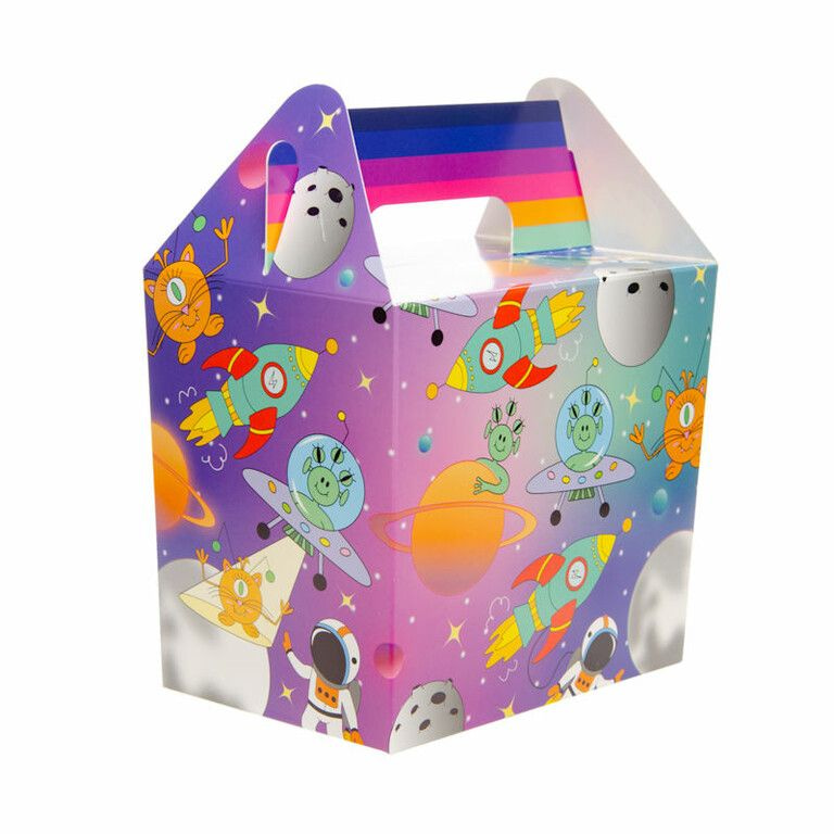 Leuke Menubox / Traktatie / Uitdeeldoosjes model: Ruimte / Space. Afmetingen: 14 x 10 x 17 Cm.