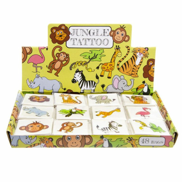 Fun Tattoo's PAKJES met elk 12x Tattoo's, Model: Jungle Dieren. Afmetingen Tattoo pakje: 4 x 4 Cm. Wordt geleverd in een mooie display met 48 PAKJES Tattoo's, Elk pakje bevat 12x Tattoo's.