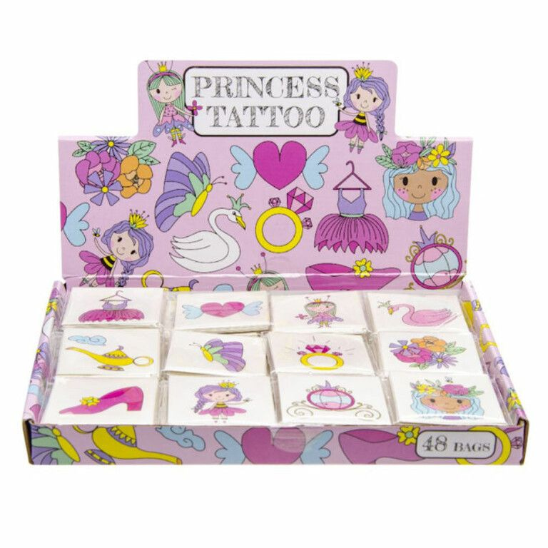 Fun Tattoo's PAKJES met elk 12x Tattoo's, Model: Prinses. Afmetingen Tattoo pakje: 4 x 4 Cm. Wordt geleverd in een mooie display met 48 PAKJES Tattoo's, Elk pakje bevat 12x Tattoo's.