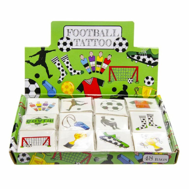 Fun Tattoo's PAKJES met elk 12x Tattoo's, Model: Voetbal. Afmetingen Tattoo pakje: 4 x 4 Cm. Wordt geleverd in een mooie display met 48 PAKJES Tattoo's, Elk pakje bevat 12x Tattoo's.