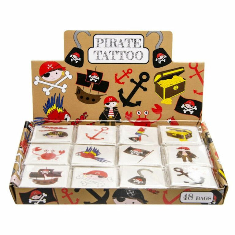 Fun Tattoo's PAKJES met elk 12x Tattoo's, Model: Piraat. Afmetingen Tattoo pakje: 4 x 4 Cm. Wordt geleverd in een mooie display met 48 PAKJES Tattoo's, Elk pakje bevat 12x Tattoo's.