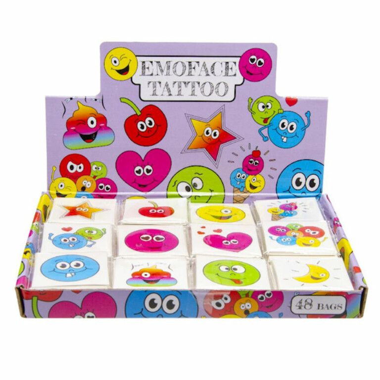 Fun Tattoo's PAKJES met elk 12x Tattoo's, Model: Smiley. Afmetingen Tattoo pakje: 4 x 4 Cm. Wordt geleverd in een mooie display met 48 PAKJES Tattoo's, Elk pakje bevat 12x Tattoo's.