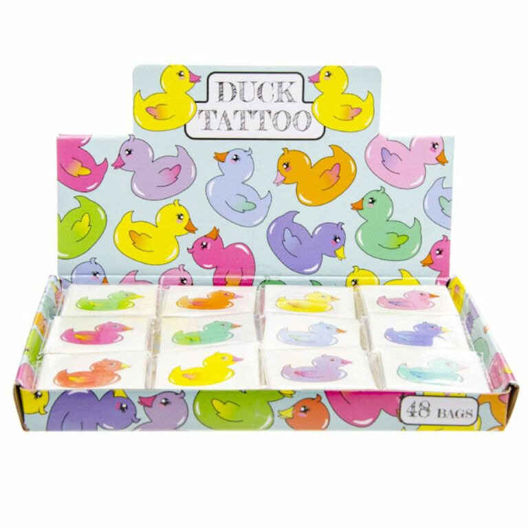 Fun Tattoo's PAKJES met elk 12x Tattoo's, Model: Eendjes. Afmetingen Tattoo pakje: 4 x 4 Cm. Wordt geleverd in een mooie display met 48 PAKJES Tattoo's, Elk pakje bevat 12x Tattoo's.