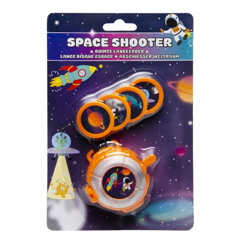 Erg leuk deze schijfen schieter, Model: Space / Ruimte. Stop de schijfjes erin en schiet ze weg. Afm. kaart: 11 x 3 x17 Cm.