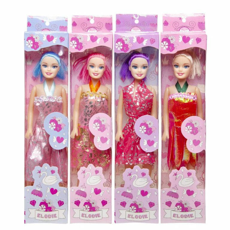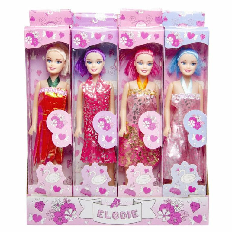Prachtige "Elodie" Speelgoed Poppen. Afzonderlijk verpakt in een prachtige doos. En samen verpakt in een luxe Display. Afmetingen Pop in doos: 6.5 x 31 x 3.5 Cm. Worden Mix kleuren geleverd.