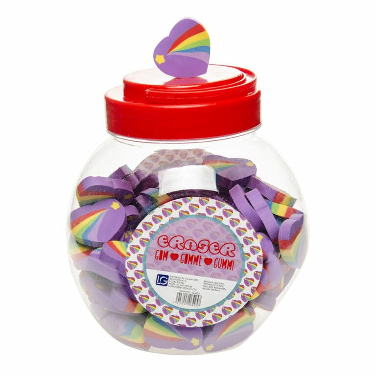 Gum in de vorm van een Hart, voorzien van Regenboog kleuren. Wordt geleverd in een pot.