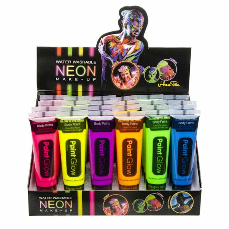 NEON Glow in the Dark Gezichtsverf, zichtbaar onder Blacklight licht. Wordt geleverd in een Display, voorzien van 6 Verschillende kleuren. Inhoud Tube: 25ML.