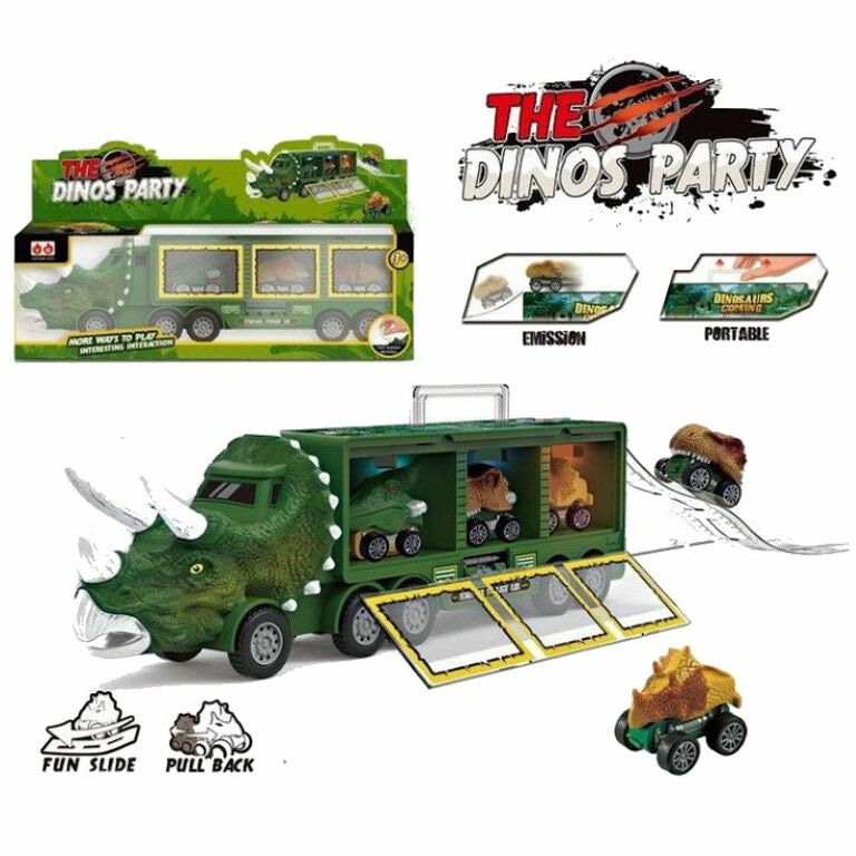 Grote Stoere Dinotruck met daarin 3x Dino Auto's. Een mooie grote speelset, voor uren lang speel plezier. Afmetingen Giftbox"35 x 10 x 18 Cm.