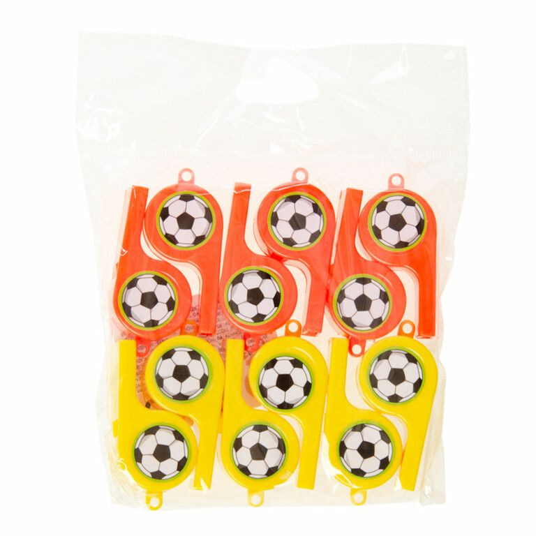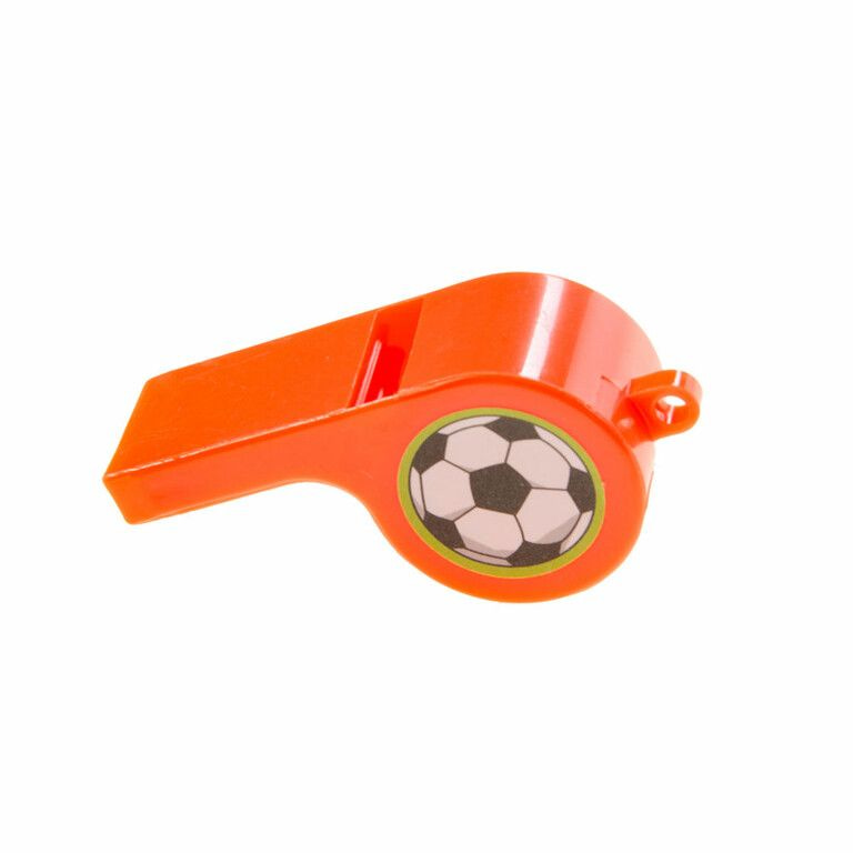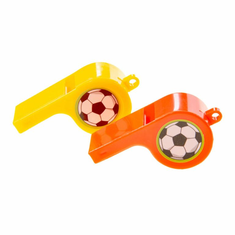 Oranje & Gele fluitjes met een sticker van een voetbal erop. Altijd een super populair artikel !.