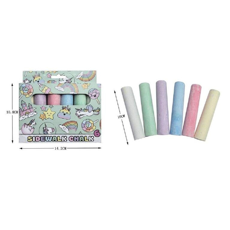 Always fun sidewalk chalk!. Each box contains 6 large sidewalk chalks. Dimensions 14 x 2.5 x 13 cm.