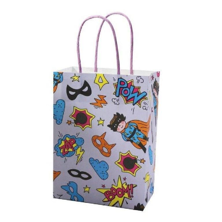 Paper Gift Bag / Treat Bags. Model: Superhero. Bag Dimensions (Without Handles) 16 x 9 x 22 Cm.
