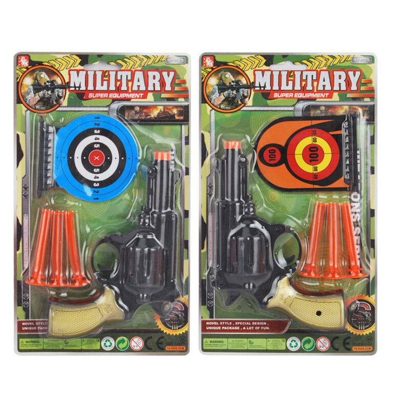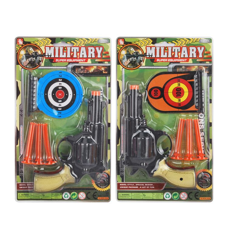 Bring action-packed fun to your toy section with this awesome Military Pistol Set! Perfect for safe indoor and outdoor target practice. Each set is blister-carded and features a toy pistol, three safe suction-cup darts, and target figures to aim at.
