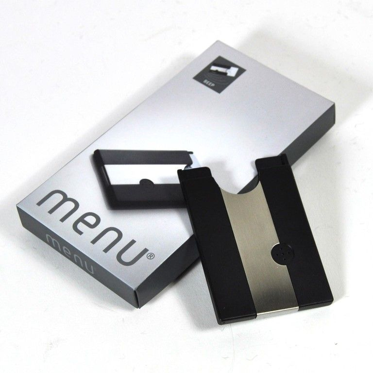 Luxury Credit / pass holder of the trademark "Menu". The pass holder is equipped with an electric mechanism starts beeping if the pass for longer than 20 seconds from the holder. The card holder is also a money clip.