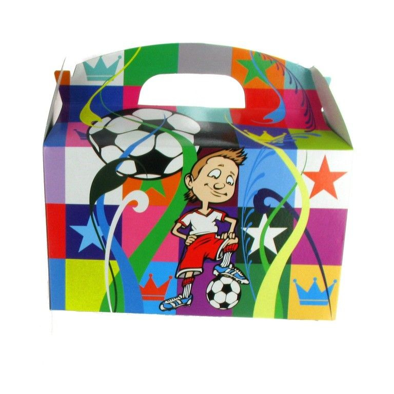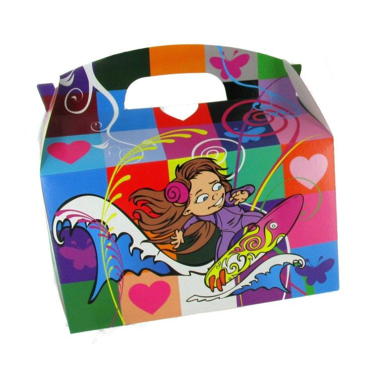 Menu box with the theme: Cool Kids This menu box consists of assorted cool prints, including a football player, ballerina, kite surfer and basketball player. Because of this cool print this enormously convenient for teenagers. (Boy and Girls ;-)) The box is easy to stack the form that ends slightly wider at the top. The bottom design has been updated with double flap thus allowing an even firmer ground.