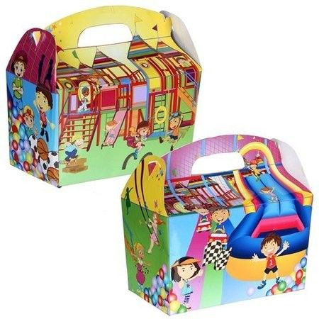 Menu box with the theme: Indoor play. with, among other things, playground equipment. The menu box is now easily stackable due to the new shape that is slightly wider at the top. The bottom design has been renewed with a double flap, thus creating an even stronger base.