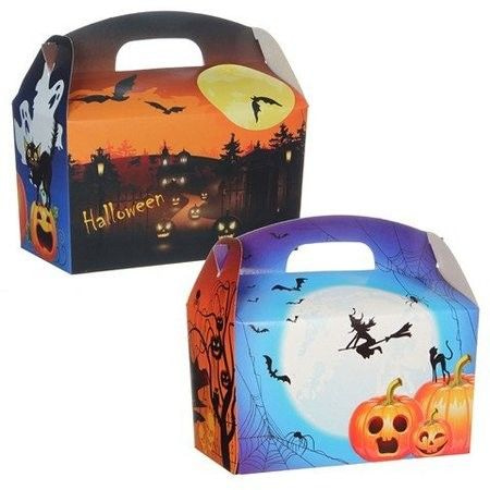 Menu box with the theme: Halloween. The creepy theme "Halloween" with cobwebs, pumpkins, bats and a witch on the broom. Creepy beautiful! The box can easily be stacked because the top is slightly wider. The bottom design has been renewed with a double flap, which means an even sturdier bottom. The bottom design has been renewed with a double flap, thus creating an even stronger base.