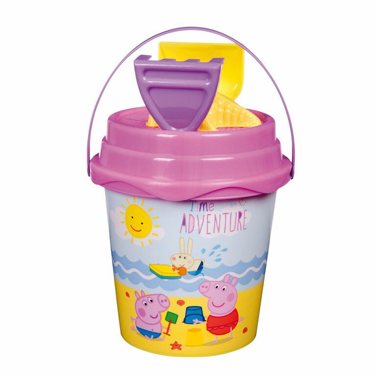 Large Pepa Pig beach set this set consists of a bucket, sieve, rake, shovel and a sand form. For a lot of fun on the beach!