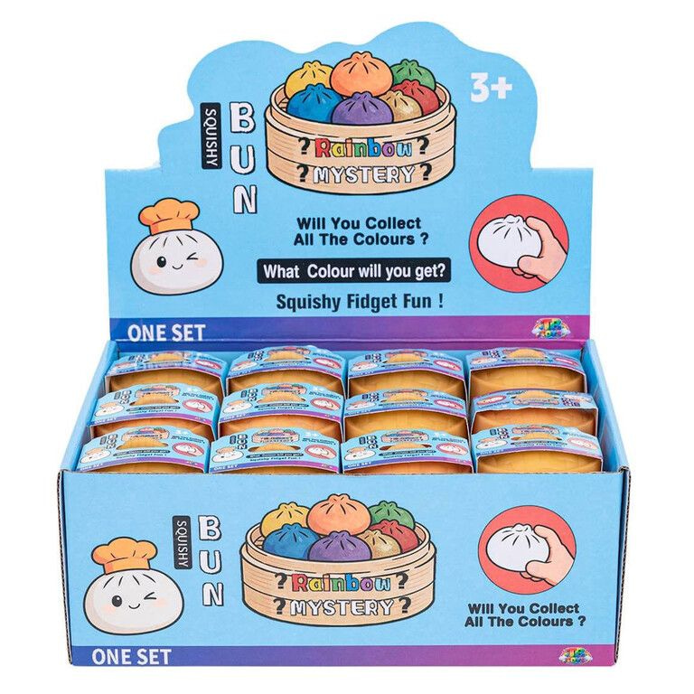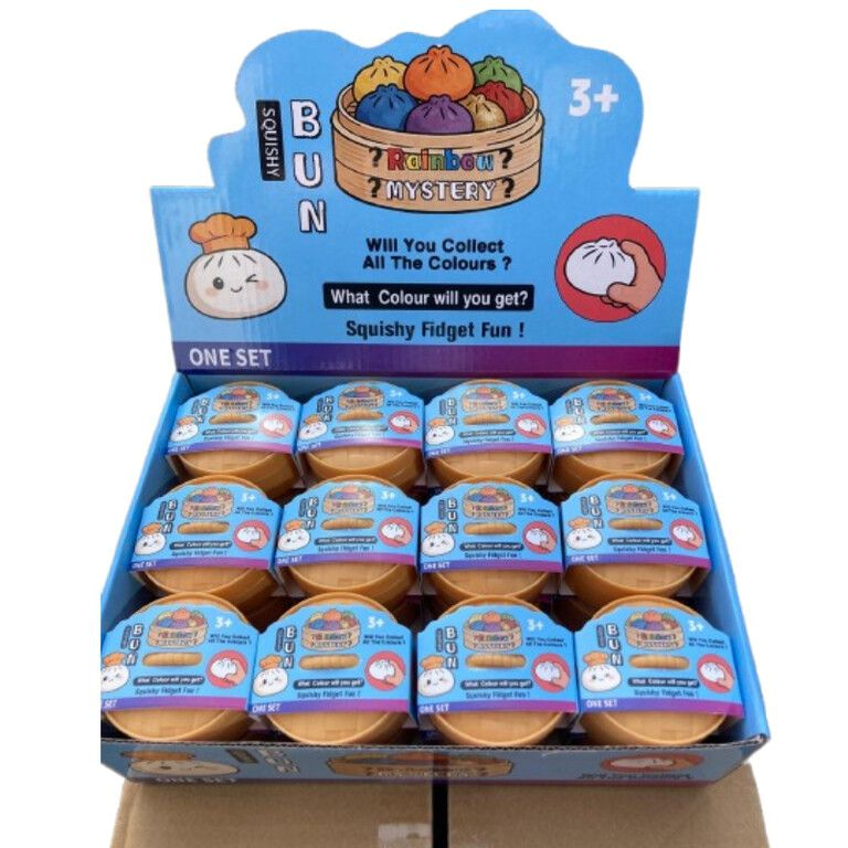 This set contains no less than 24 pieces in a handy display, perfect for resale, gifts, or distribution. The squishy buns feel wonderfully soft and slowly return to their original shape. This makes them not only fun toys but also ideal as a tool against stress and tension.