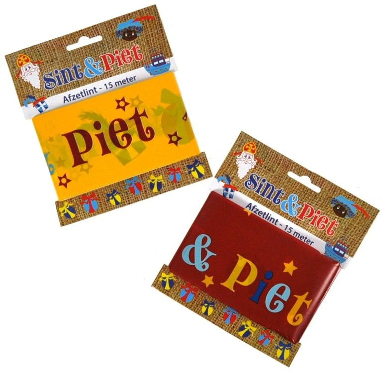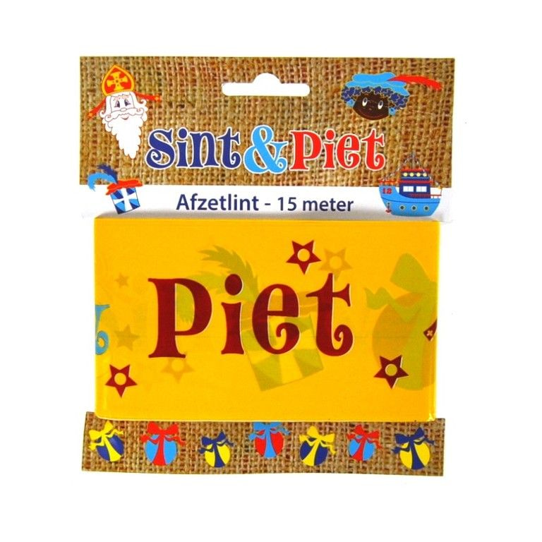 A long barrier tape for Sinterklaas and Zwarte Piet. On the ribbon is written the text "and St. Peter." There are also nice pictures of gifts and Sinterklaas and Zwarte Piet on.