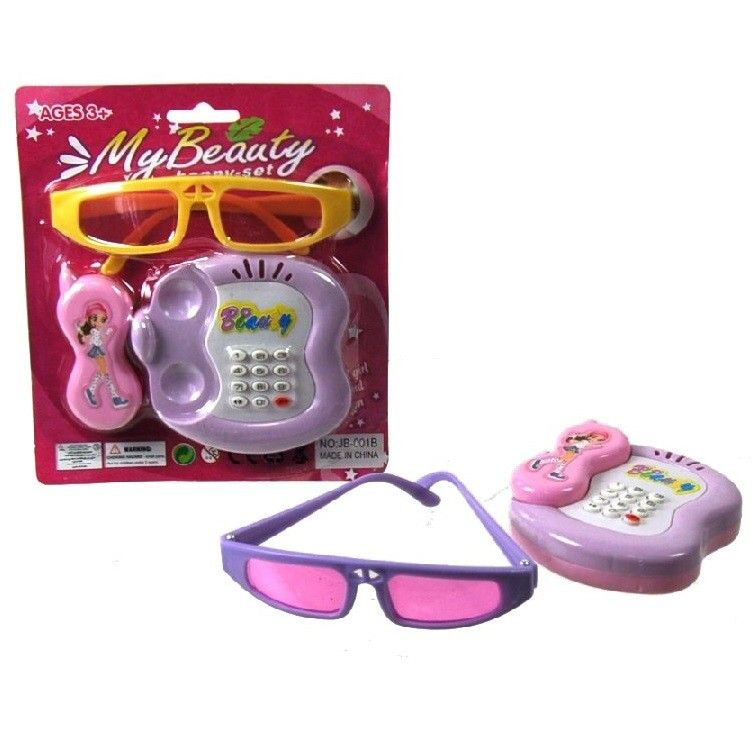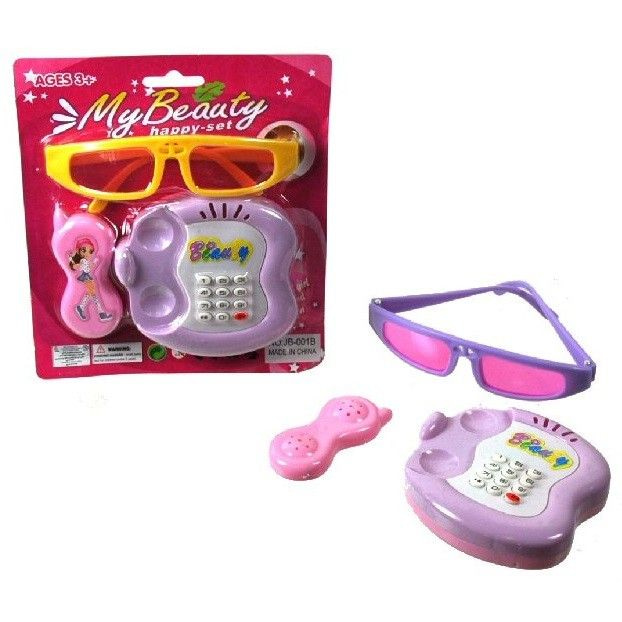 Nice little playset for girls, packed on card. A colorful toy phone that makes different sounds when you press the buttons. And a nice sun glasses for children. Batteries not included.